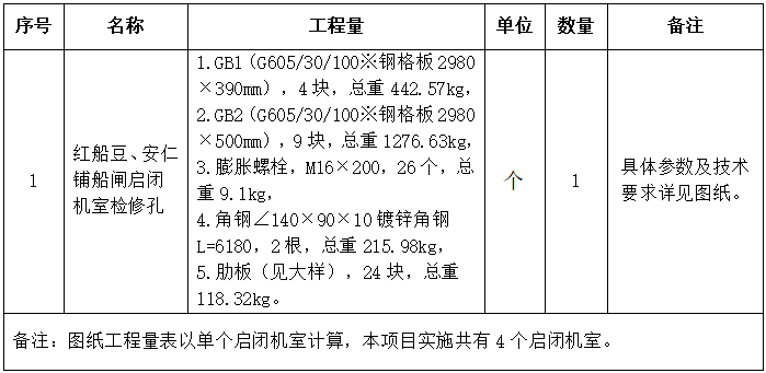 一、采購內(nèi)容:紅船豆、安仁鋪船閘啟閉機(jī)室檢修孔鋼蓋板重新制作及安裝采購,詳見下表,紅船豆、安仁鋪船閘啟閉機(jī)室個(gè)數(shù)共4個(gè),采購總預(yù)算價(jià)為人民幣111800元(單價(jià)不超過27950元/個(gè))。