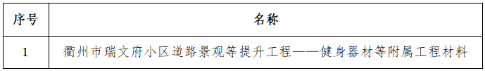 一、采購(gòu)項(xiàng)目名稱:衢州市瑞文府小區(qū)道路景觀等提升工程——健身器材等附屬工程材料采購(gòu)項(xiàng)目