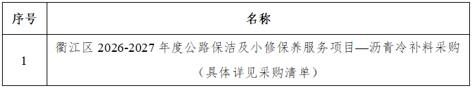 一、采購項(xiàng)目名稱:衢江區(qū)2026-2027年度公路保潔及小修保養(yǎng)服務(wù)項(xiàng)目——瀝青冷補(bǔ)料采購