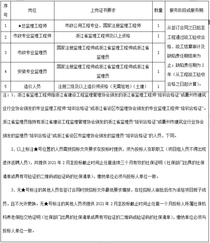 要求具備有效的國(guó)家注冊(cè)監(jiān)理工程師證書(shū),注冊(cè)專(zhuān)業(yè)為市政公用工程。【國(guó)家注冊(cè)監(jiān)理工程師:衢州市區(qū)(含市本級(jí)、柯城區(qū)、衢江區(qū)、西區(qū)、綠色產(chǎn)業(yè)集聚區(qū),余同)外不得有在建工程的監(jiān)理業(yè)務(wù)(含已中標(biāo)工程或?yàn)榈谝恢袠?biāo)候選人的監(jiān)理業(yè)務(wù),余同),衢州市區(qū)不得有2個(gè)在建工程的監(jiān)理業(yè)務(wù)】。