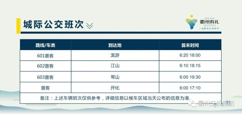 城際公交共設(shè)置班線4條,分別前往龍游、江山、常山、開化等各縣(市),平均30分鐘便有一趟發(fā)車。