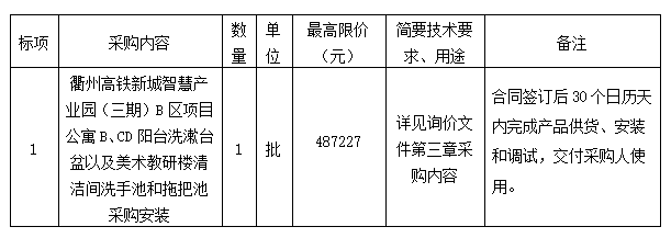 參照《中華人民共和國(guó)政府采購(gòu)法》、《政府采購(gòu)貨物和服務(wù)招標(biāo)投標(biāo)管理辦法》等規(guī)定,浙江求是工程咨詢監(jiān)理有限公司受衢州市智慧產(chǎn)業(yè)投資發(fā)展有限公司的委托,就衢州高鐵新城智慧產(chǎn)業(yè)園(三期)B區(qū)項(xiàng)目公寓B、CD陽臺(tái)洗漱臺(tái)盆以及美術(shù)教研樓清潔間洗手池和拖把池采購(gòu)安裝項(xiàng)目進(jìn)行詢價(jià),本項(xiàng)目為非依法必招項(xiàng)目,現(xiàn)請(qǐng)合格供應(yīng)商參加投標(biāo)。