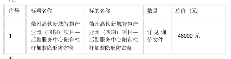 二、項目名稱:衢州高鐵新城智慧產(chǎn)業(yè)園(四期)項目—后勤服務(wù)中心陽臺欄桿加裝隱形防盜窗