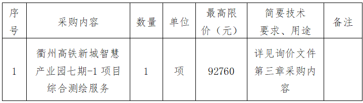 根據(jù)《衢州市國有企業(yè)采購管理辦法(試行)》規(guī)定并參照《中華人民共和國招標(biāo)投標(biāo)法》《中華人民共和國政府采購法》等有關(guān)規(guī)定,衢州市兩山工程咨詢管理有限公司受衢州市智慧產(chǎn)業(yè)投資發(fā)展有限公司的委托,對衢州高鐵新城智慧產(chǎn)業(yè)園七期-1項(xiàng)目綜合測繪服務(wù)進(jìn)行詢價采購,歡迎準(zhǔn)時參加。