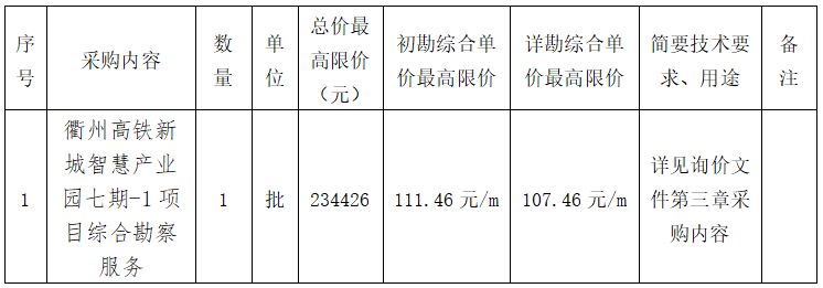 根據(jù)《衢州市國有企業(yè)采購管理辦法(試行)》規(guī)定并參照《中華人民共和國招標(biāo)投標(biāo)法》《中華人民共和國政府采購法》等有關(guān)規(guī)定,衢州市兩山工程咨詢管理有限公司受衢州市智慧產(chǎn)業(yè)投資發(fā)展有限公司的委托,對衢州高鐵新城智慧產(chǎn)業(yè)園七期-1項(xiàng)目綜合勘察服務(wù)進(jìn)行詢價(jià)采購,歡迎準(zhǔn)時(shí)參加。