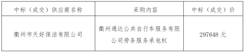 衢州通達(dá)公共自行車服務(wù)有限公司勞務(wù)服務(wù)承包權(quán)項(xiàng)目中標(biāo)(成交)結(jié)果公告