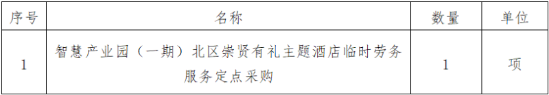 一、采購項(xiàng)目名稱:智慧產(chǎn)業(yè)園(一期)北區(qū)崇賢有禮主題酒店臨時勞務(wù)服務(wù)定點(diǎn)采購