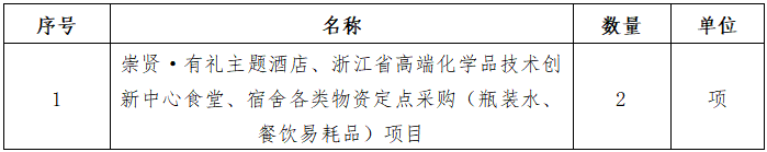 一、采購項(xiàng)目名稱:崇賢·有禮主題酒店、浙江省高端化學(xué)品技術(shù)創(chuàng)新中心食堂、宿舍各類物資定點(diǎn)采購(瓶裝水、餐飲易耗品)項(xiàng)目