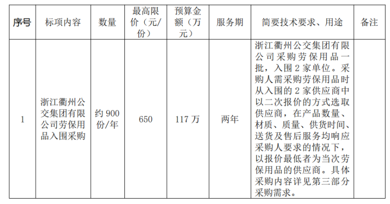 二、項目名稱:浙江衢州公交集團(tuán)有限公司勞保用品入圍采購項目
