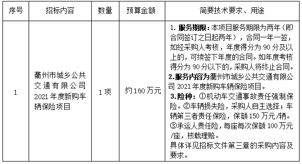 二、項目名稱:衢州市城鄉(xiāng)公共交通有限公司2021年度新購車輛保險項目