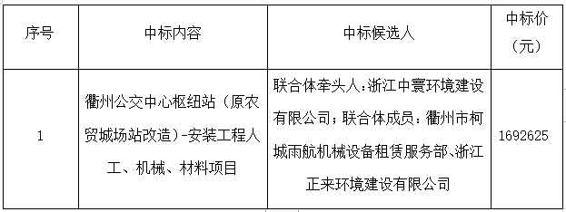 根據(jù)《中華人民共和國(guó)招標(biāo)投標(biāo)法》等有關(guān)法律法規(guī)的規(guī)定,浙江建安工程管理有限公司受浙江衢交建設(shè)工程有限公司委托,對(duì)其衢州公交中心樞紐站(原農(nóng)貿(mào)城場(chǎng)站改造)-安裝工程人工、機(jī)械、材料項(xiàng)目采用公開(kāi)招標(biāo)方式進(jìn)行招標(biāo)。浙江建安工程管理有限公司于2021年6月18日09時(shí)30分在衢州市交通投資集團(tuán)二樓開(kāi)標(biāo)廳(衢州市柯城區(qū)白云街道花園中大道86號(hào))進(jìn)行開(kāi)評(píng)標(biāo)。評(píng)標(biāo)結(jié)果及相關(guān)事宜現(xiàn)公示如下: