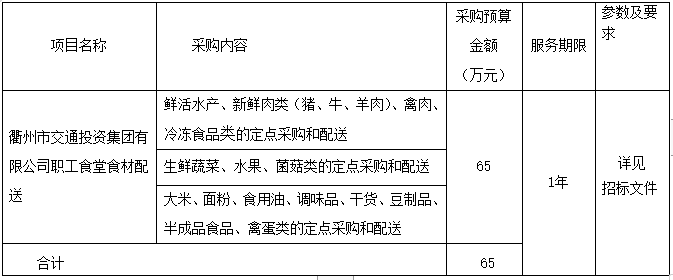參照《中華人民共和國(guó)政府采購(gòu)法》、《政府采購(gòu)貨物和服務(wù)招標(biāo)投標(biāo)管理辦法》等規(guī)定,浙江中信工程咨詢有限公司受衢州市交通投資集團(tuán)有限公司委托,就衢州市交通投資集團(tuán)有限公司職工食堂食材配送采購(gòu)項(xiàng)目進(jìn)行公開(kāi)招標(biāo),歡迎國(guó)內(nèi)合格的供應(yīng)商前來(lái)投標(biāo)。