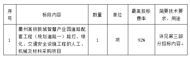 二、項目名稱:衢州高鐵新城智慧產(chǎn)業(yè)園道路配套工程(規(guī)劃道路一)路燈、綠化、交通安全設施工程的人工、機械及材料采購項目