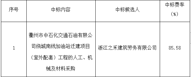 衢州市中石化交通石油有限公司繞城南線加油站遷建項目(室外配套)工程的人工、機(jī)械及材料采購結(jié)果公告