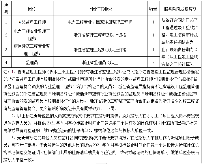 要求具備有效的國家注冊監(jiān)理工程師證書,注冊專業(yè)為電力工程。國家注冊監(jiān)理工程師:衢州市區(qū)(含市本級、柯城區(qū)、衢江區(qū)、智慧新城、智造新城,余同)外不得有在建工程的監(jiān)理業(yè)務(含已中標工程或為第一中標候選人的監(jiān)理業(yè)務,余同),衢州市區(qū)不得有三個在建工程的監(jiān)理業(yè)務;
