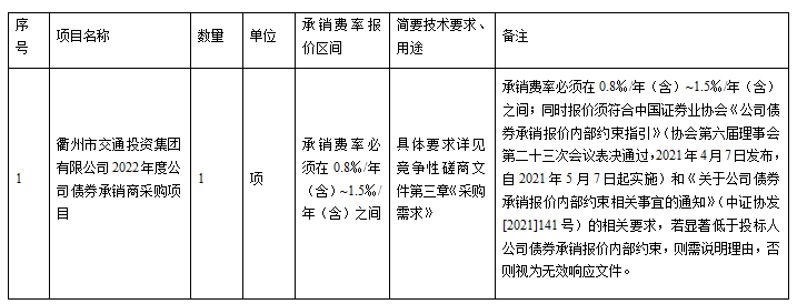 項(xiàng)目名稱:衢州市交通投資集團(tuán)有限公司2022年度公司債券承銷商采購項(xiàng)目
