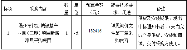 參照《中華人民共和國政府采購法》、《政府采購貨物和服務(wù)招標(biāo)投標(biāo)管理辦法》等規(guī)定,衢州市智信工程咨詢有限公司受衢州市智慧產(chǎn)業(yè)投資發(fā)展有限公司的委托,就衢州高鐵新城智慧產(chǎn)業(yè)園(二期)項目新增家具采購項目進(jìn)行詢價,本項目為非依法必招項目,現(xiàn)請合格供應(yīng)商參加投標(biāo)。