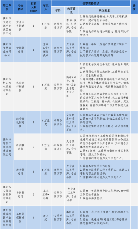衢州市衢通發(fā)展集團(tuán)有限公司因工作需要,現(xiàn)面向社會公開招聘10名勞務(wù)派遣人員。具體事項公告如下: