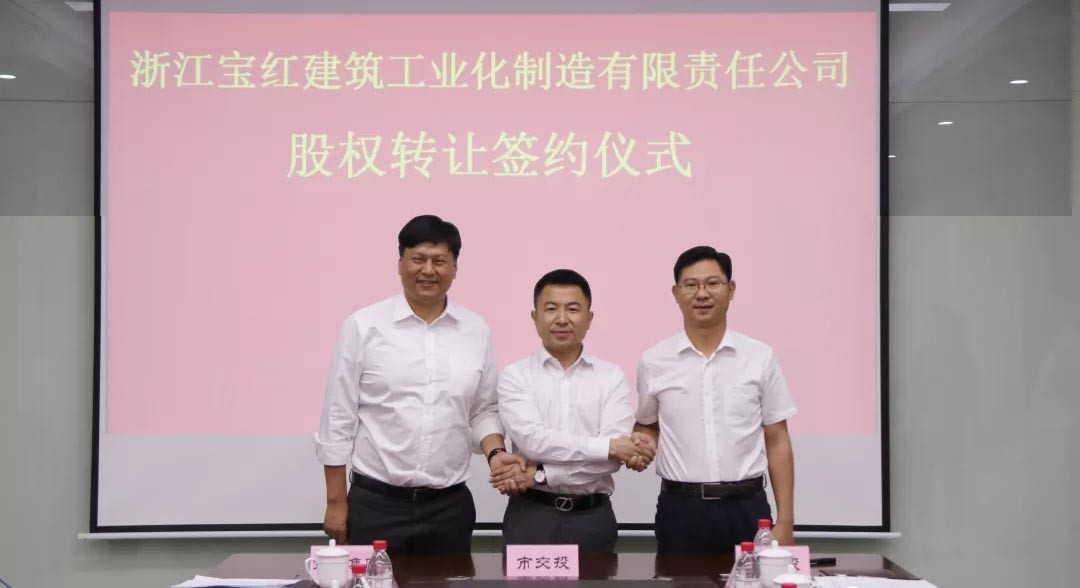 2019年6月6日11時18分,浙江寶紅建筑工業(yè)化制造有限責(zé)任公司股權(quán)轉(zhuǎn)讓簽約儀式隆重舉行。市交投集團(tuán)董事長方世忠、衢江建投總經(jīng)理黃利、寶業(yè)集團(tuán)總經(jīng)理龐巍祥、寶紅公司總經(jīng)理婁忠華等出席儀式并參加簽約。寶紅公司原為寶業(yè)集團(tuán)全資子公司,此次股權(quán)